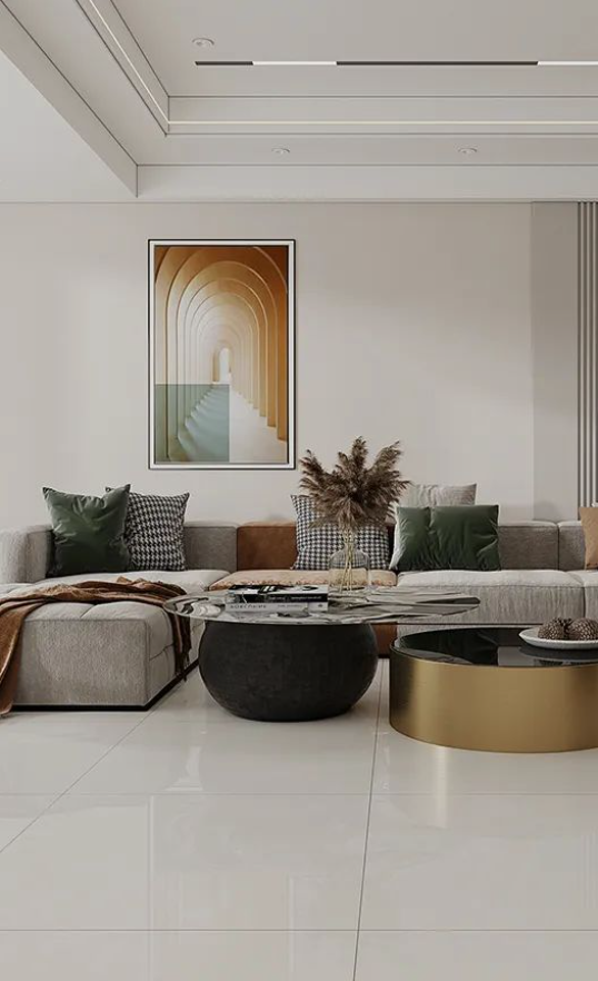 暖色系的帕爾馬,若隱若現的紋理像是在低聲述說著大地無限的熱情與豪邁,結合金屬色的茶幾與藝術掛畫,將和諧靜謐灌注于居者的視覺之中,讓色調顯得溫柔、恬適。